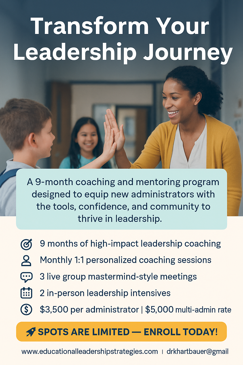 Contact us today to find out more!Click HERE or email us at DrKHartbauer@gmail.com coaching & mentorship A 9 month coaching and mentoring program designed to equip new administrators with the tools, confidence, and community to thrive in leadership!